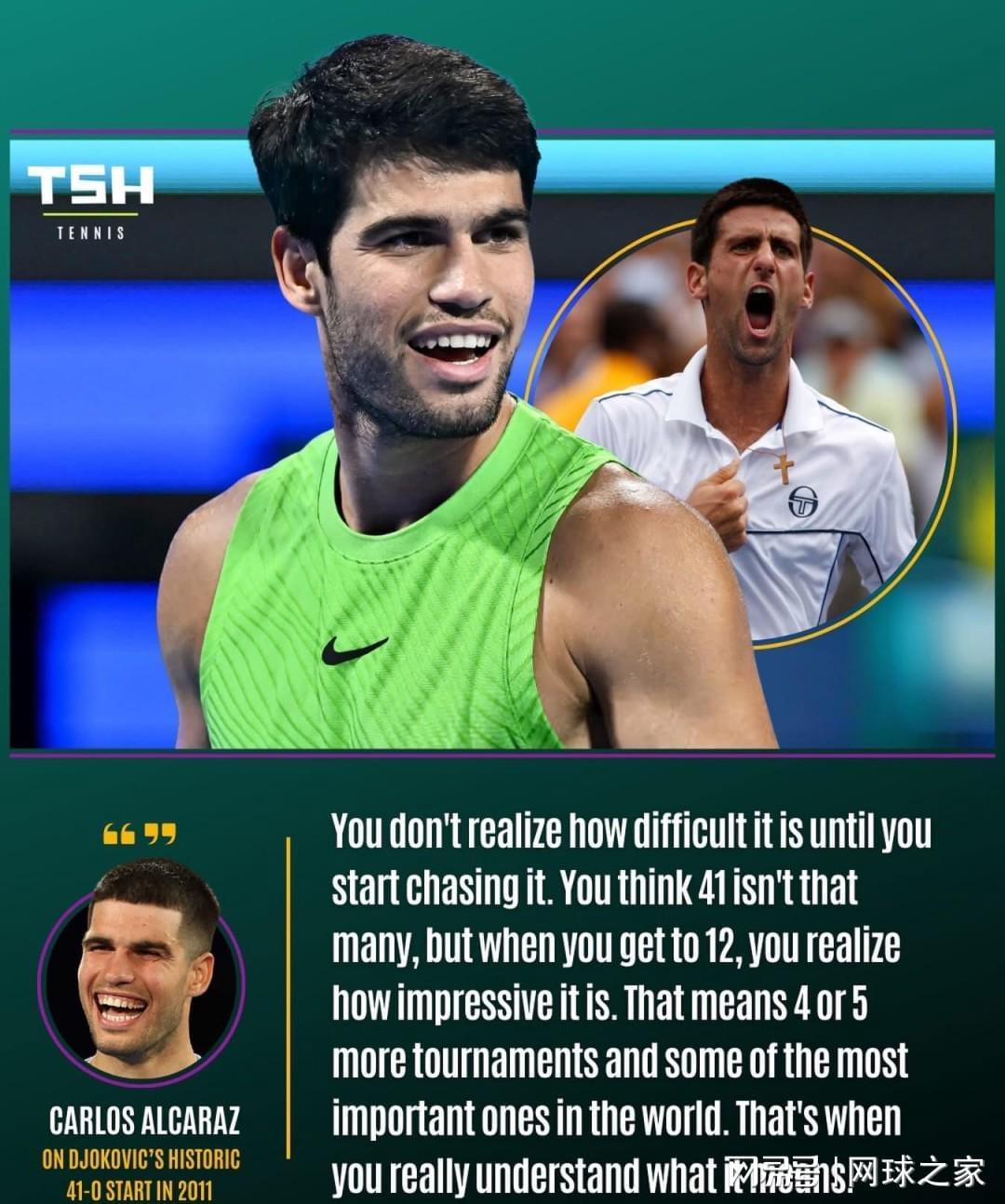 “现在轮到我开始追逐它,你才会意识到这有多难。你觉得41胜不算多,但当你达到12胜时,你就会意识到它已经让你无法忘记,这意味着还要再赢4到5场比赛,其中一些还是世界上最重要的比赛,那时你才会真正明白这意味着什么。”阿尔卡拉斯坦言,自己现在开始追逐德约的这项纪录时,觉得“简直就不是人能做到的”,这句炸裂之语也让塞尔维亚天王的超级伟大一览无遗。